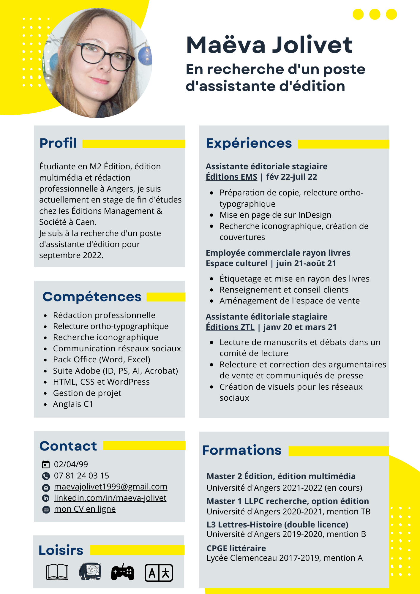 Je suis étudiante en M2 Édition, édition multimédia et rédaction professionnelle à l'université d'Angers. Je suis actuellement assistante d'édition stagiaire chez les Éditions EMS - Management & Société à Caen. Je souhaite intégrer une maison d’édition en tant qu’assistante éditoriale à la fin de mon cursus.